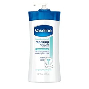 Product Description : Amazon.com Product Description : VASELINE INTENSIVE RESCUE REPAIRING MOISTURE Fragrance Free Body Lotion Relieves and accelerates the healing of very dry skin Repairing Moisture Lotion with Stratys-3 multi-layer moisture relieves dryness after one use and helps heal and strengthen dry skin in three days. This unique formula hydrates all layers of dry skin, for intensive moisturization that works quickly and effectively.Instantly boosts moisture levels by 300%. Delivers therapeutic moisture for 24 hours of hydration. Leaves a clean, non-greasy feel. Heal dry skin with Vaseline INTENSIVE RESCUEbody lotions. The Intensive Rescue line of lotions from Vaseline instantly boosts moisture levels and delivers therapeutic hydration for 24 hours of healthy moisturized skin, and a non greasy feel. Vaseline has been helping skin look beautiful and feel healthy since 1870. Vaseline products feel good and do good for skin. Explore the entire line of Intensive Rescue products Product Description : Vaseline Intensive Rescue Repairing Moisture Lotion hydrates and heals extra dry skin. Enriched with clinically-proven moisturizers and vitamins, this formula starts working to heal even the most severely dry skin upon contact and helps keep it from coming back. This fragrance-free, hypo-allergenic moisturizing lotion absorbs quickly to provide intensive healing power that's also ideal for sensitive skin.